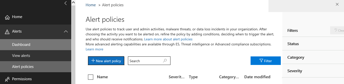 When you visit the Alerts | Alert policies page you will see that Microsoft has created some preconfigured alerts. For this example we are going to create our own log alert that fires everytime an Office 365 user creates an anonymous share link from OneDrive or Sharepoint. This is a good alert to have configured since anonymous links can lead to data leakage.
